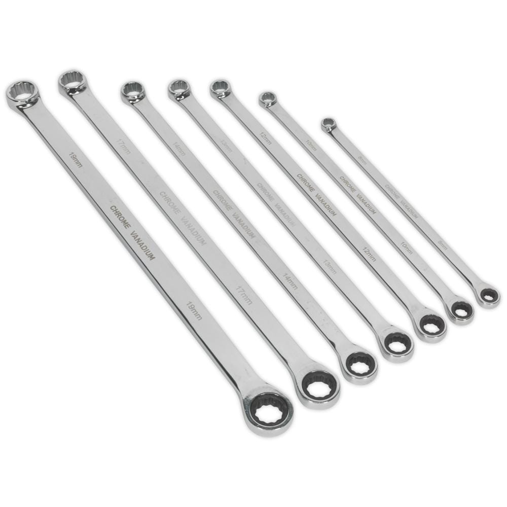 Sealey 7 Piece Extra Long Ratchet and Fixed Ring Spanner Set