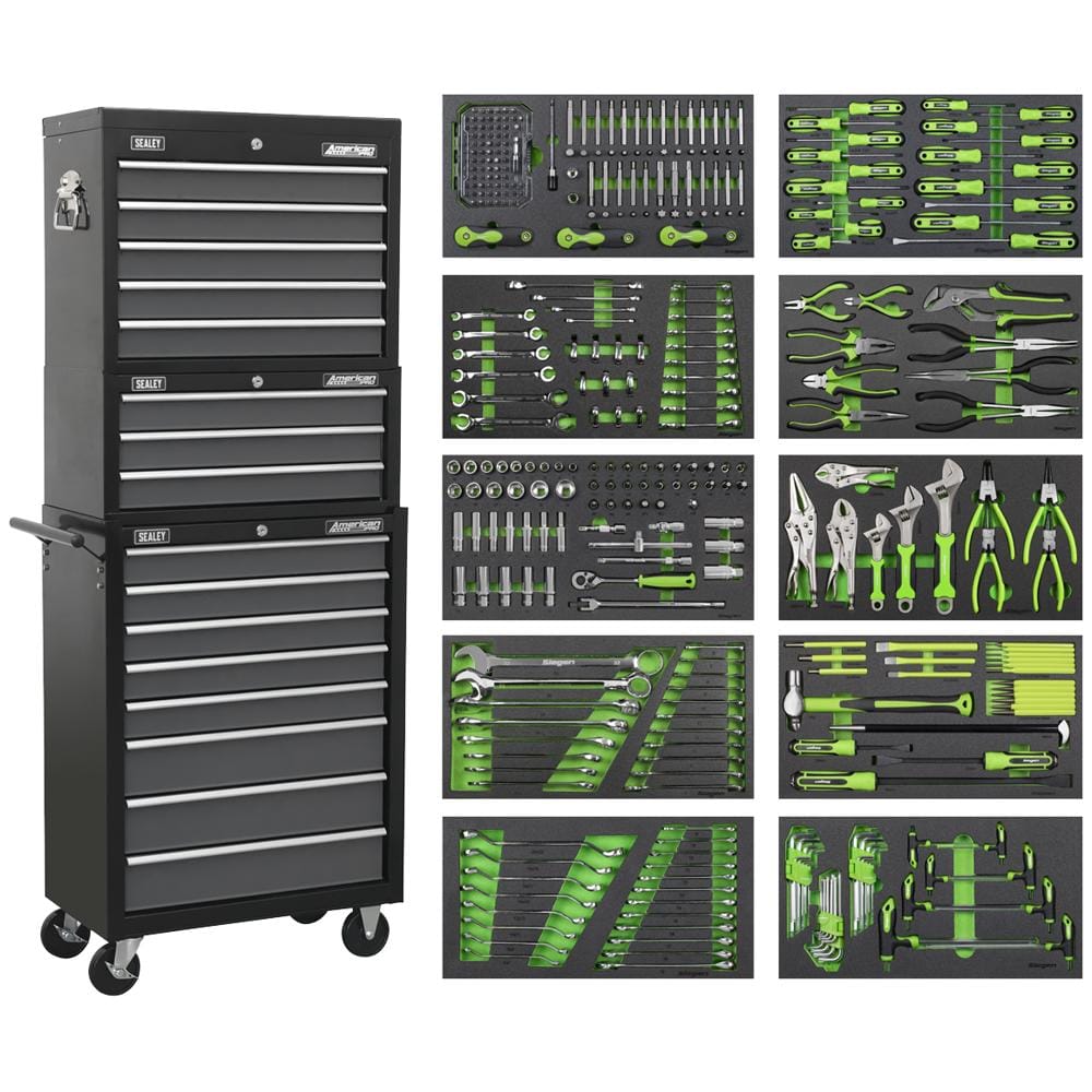 Sealey American Pro 16 Drawer Roller Cabinet, Mid and Top Tool Chests + 420 Piece Tool Kit